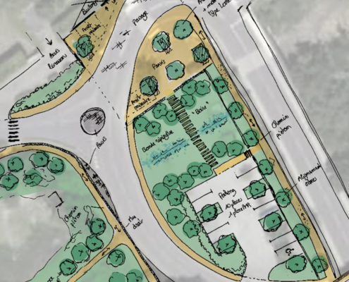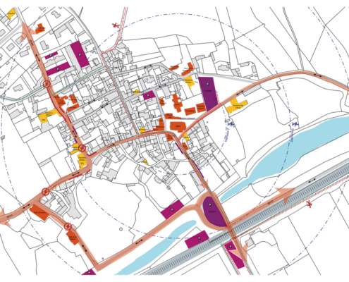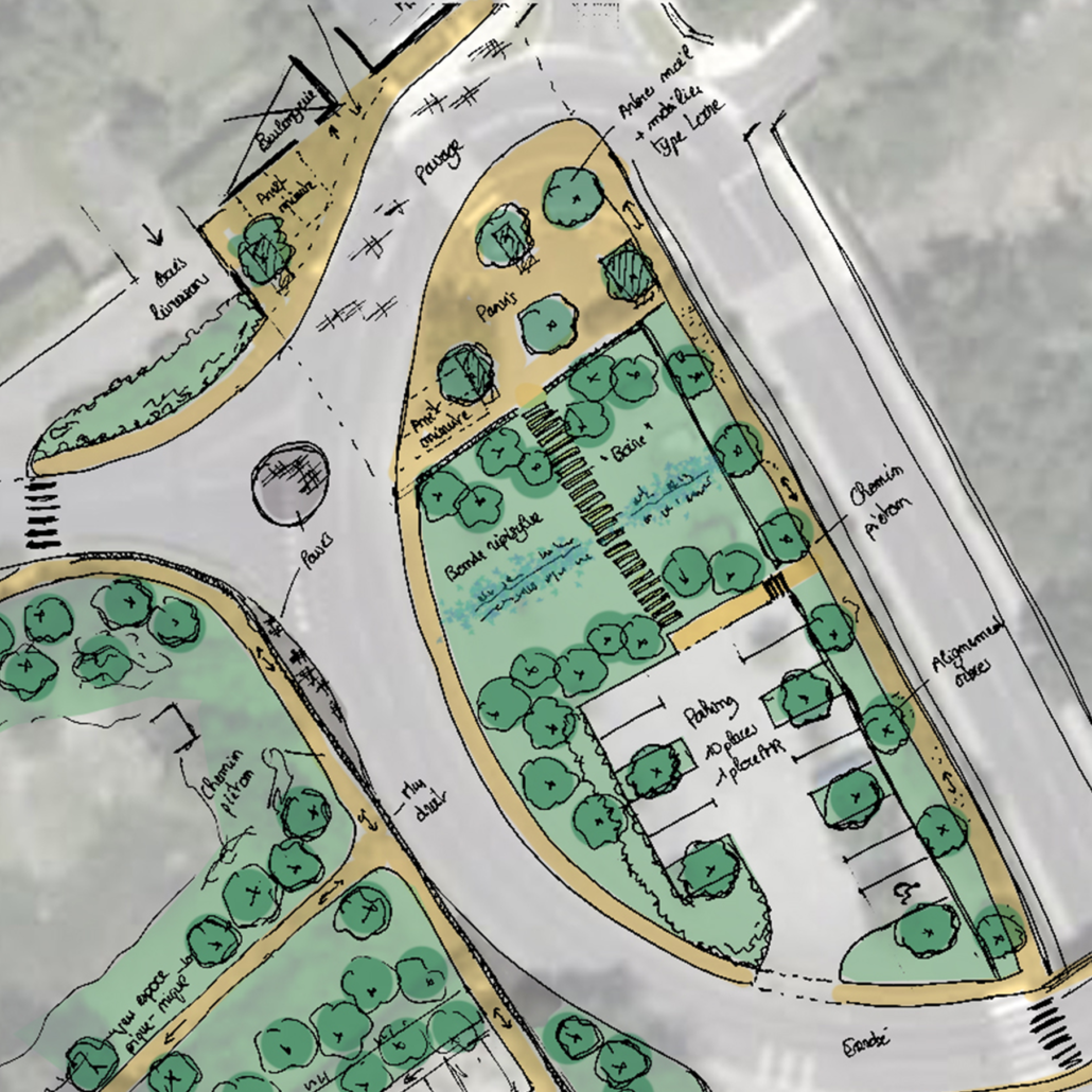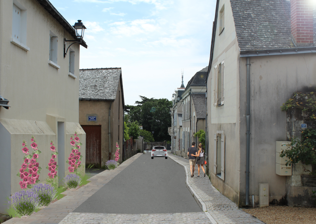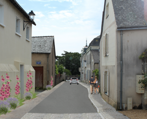 Au delà d’une simple réorganisation fonctionnelle des espaces publics et de la place du stationnement notamment, il s’agit dans ce projet de faire ressortir les éléments paysagers qui font l’ADN et l’identité du bourg pour pouvoir assurer son développement sans compromettre sa qualité patrimoniale.