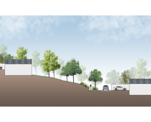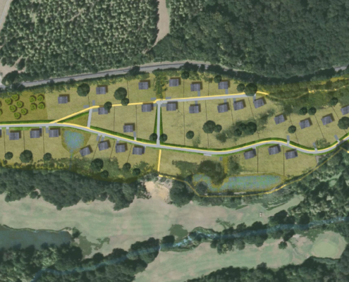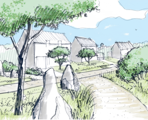 Dans la continuité du golf de Baugé-en-Anjou, s’appuyant sur un ensemble forestier, ce quartier reprend le tracé d’un projet de lotissement ancien qui n’a pu voir le jour. S’appuyant sur la trame viaire déjà réalisée ce projet développe des parcelles généreuses (répondant aux besoins d’une clientèle haut de gamme en relation avec le golf) et des espaces paysagers qui dessinent une interface végétale entre les espaces soignés du golf et les landes et boisements naturels.