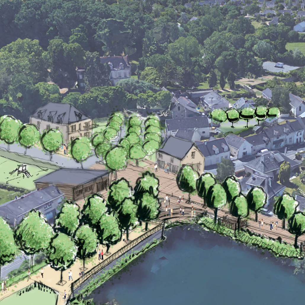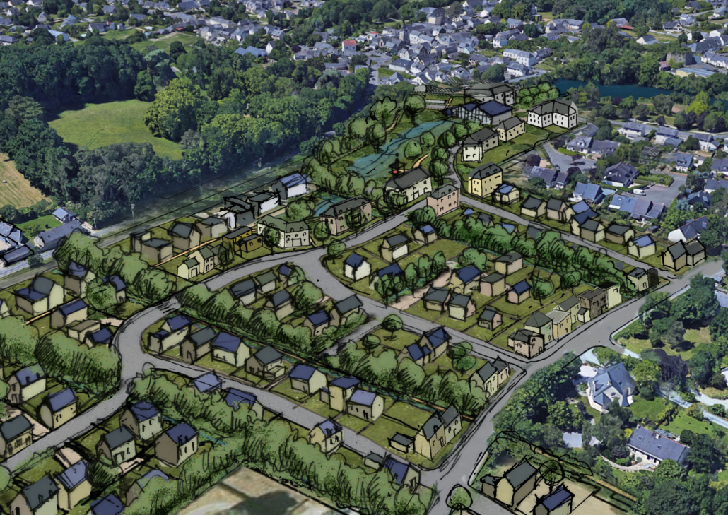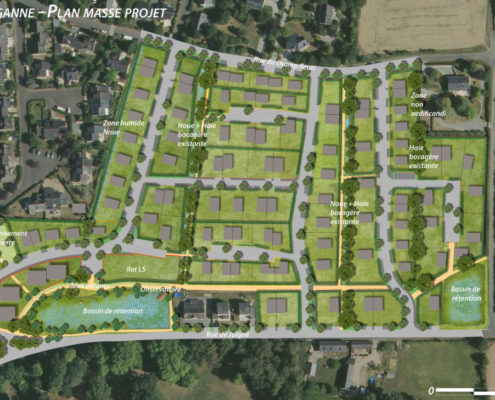 Amorçant l’extension ouest du bourg, la ZAC des Pâtisseaux s’inscrit comme son nom l’indique dans d’anciennes pâtures bocagères. La composition du nouveau quartier s’appuie tout naturellement sur les haies bocagères existantes afin de proposer aux futurs habitants des cheminements doux isolés des circulations. Les espaces ludiques et de repos sont composés en lien avec la gestion des eaux pluviales.